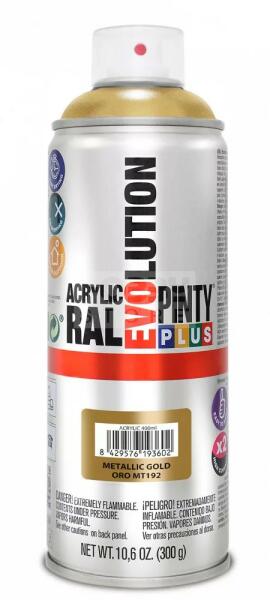 PINTYPLUS EVO AKRIL METAL SPRAY GOLD MT192 - METÁL ARANY 400ML PP266 Biciklik, gördeszkák, sárvédők, sisakok stb. felújjítására karbantartására, dekorálására használható. Kül- és beltérre egyaránt alkalmas, szinte minden felületre (fa, fém, karton, papír, üveg és a műanyagok többsége). Az PintyPlus Evolution sorozat kiváló minőségű, magas pigmenttartalommal rendel