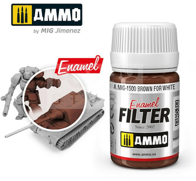 AMMO By Mig - BROWN FOR WHITE Filter - Filterező folyadék makettezőknek 35ml - AMIG1500 Egyszerűen használható filterező folyadék makettezőknek. Az AMMO enamel alapú általános bemosó-átmosó, effect és filter folyadékok, melyek nagyon sokrétűen használhatóak. Alap technika a makettesek és wargamesek számára. Az AMMO By Mig effekt bemosók kiválóan alkalmasak a makettek, fi