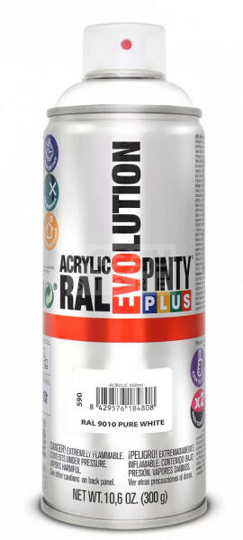 PINTYPLUS EVO AKRIL SPRAY RAL9010 - FEHÉR (PURE WHITE) 400ML PP590 Az PintyPlus Evolution sorozat kiváló minőségű, magas pigmenttartalommal rendelkező, ultra gyorsan száradó, oldószeres akril festék spray család. A palettán 70 különböző szín, 3 lakk, 6 metál spray és 5 fluoreszkáló spray található. Univerzálisan használható, szinte bármilyen felületen. Magas pigment mi