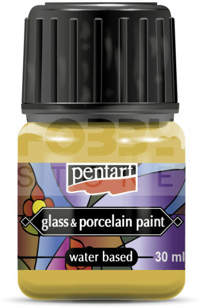 Pentart Üveg és porcelánfesték arany 30 ml 21348 Fényes, átlátszó vagy fedő, vízbázisú festék üveg-, porcelán- és fémfelületek díszítéséhez. A színek egymással jól keverhetők, világosításukhoz Pentart üveg&porcelánfesték médiumot használjunk. Ügyeljünk arra, hogy a díszítendő felület zsír- és pormentes legyen. Fényes, vízbázisú festék üveg-, porc