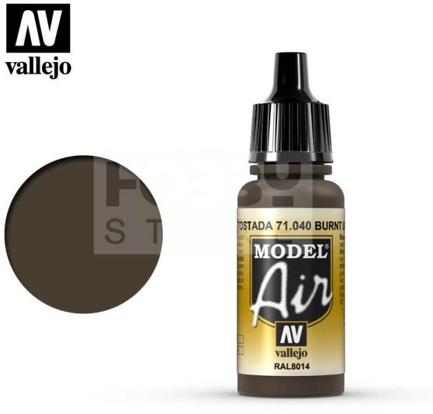 Vallejo Model Air Burnt Umber akrilfesték 71040V A Vallejo Model Air széria mattra száradó akrilfesték airbrush (szórópisztoly) használathoz lett kifejlesztve. A színválaszték a közelmúltban használt katonai színek legteljesebb választékát tartalmazza, beleértve az I. és a II. világháborút valamint a napjainkban használt színeket is. Mindegyik Model Air szín a meglévő