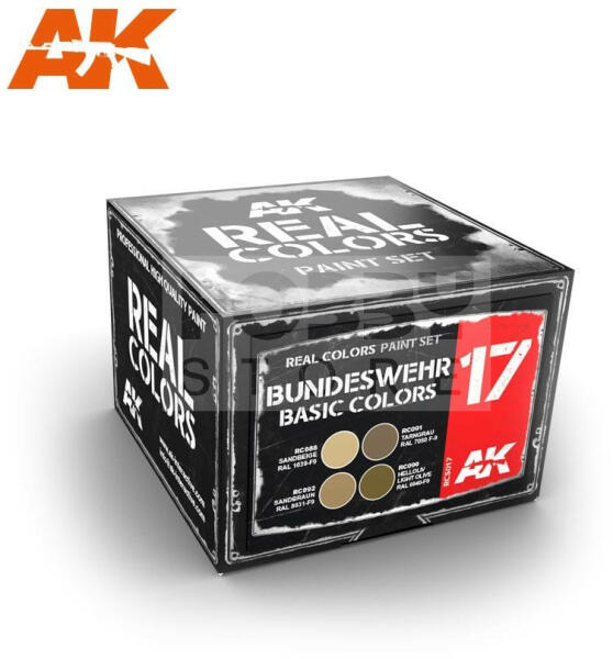 AK Interactive - REAL COLORS BUNDESWEHR BASIC DESERT COLORS SET - festékszett RCS017 Tematikus festékszett 4 darab AK Real Color festékkel. Magas miőségű akril lakk bázisú festékszett modellezéshez-makettezéshez. Használatával a lehető legpontosabb színeket érhetjük el méretarányos modelljeinken. Rendkívül jól használható festékszóróval. Az AK -Interactive Real Color fes