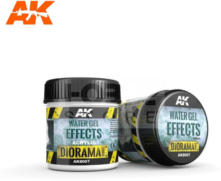 AK-Interactive WATER GEL EFFECTS 100 ml AK8007 Gél, mozgó víz, hullám replikálására imitálására. A tökéletes eredmény érdekében 0.1 és 3 mm-es rétegekben vigyük fel a felületre. Az AK-Interactive dioráma textúrái a piac legszélesebb szortimenttel rendelkező termékei melyekkel könnyedén jeleníthetünk meg talaj, víz, városi vagy egyéb alapokat, legyen akár őszi, té