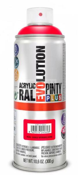 PINTYPLUS EVO AKRIL SPRAY RAL2002 - ÉLÉNKPIROS (VERMILION) 400ML PP399 Az PintyPlus Evolution sorozat kiváló minőségű, magas pigmenttartalommal rendelkező, ultra gyorsan száradó, oldószeres akril festék spray család. A palettán 70 különböző szín, 3 lakk, 6 metál spray és 5 fluoreszkáló spray található. Univerzálisan használható, szinte bármilyen felületen. Magas pigme