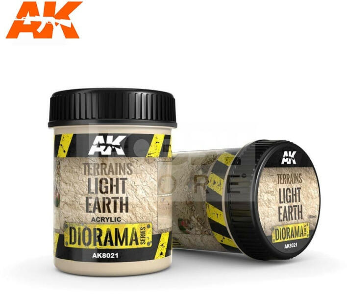 AK-Interactive TERRAINS LIGHT EARTH (Világos föld textúra) 250 ml AK8021 Világos föld felületeket hozhatunk létre vele diorámáinkon. Nedves állapotban formázható, szárazon csiszolható és festhető. Az AK-Interactive dioráma textúrái a piac legszélesebb szortimenttel rendelkező termékei melyekkel könnyedén jeleníthetünk meg talaj, víz, városi vagy egyéb alapokat, legyen