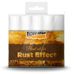 4 db vízbázisú akrilfestéket és egy 3D port tartalmazó készlet rozsdahatás eléréséhez. Váltakozva vigyük fel a festéket a világostól a sötétebb árnyalat felé haladva a kívánt hatás eléréséig. Szórjuk a port a még nedves festékre, majd ecsettel finoman nyomjuk bele és fessük át felülről, így utánozhatjuk a rozsda strukturált felületét.