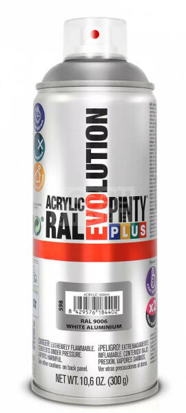 PINTYPLUS EVO AKRIL SPRAY RAL9006 - FEHÉR ALUMÍNIUM (WHITE ALUMINIUM) 400ML PP598 Az PintyPlus Evolution sorozat kiváló minőségű, magas pigmenttartalommal rendelkező, ultra gyorsan száradó, oldószeres akril festék spray család. A palettán 70 különböző szín, 3 lakk, 6 metál spray és 5 fluoreszkáló spray található. Univerzálisan használható, szinte bármilyen felületen.
