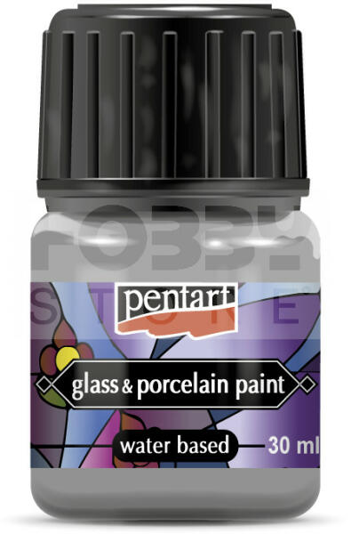Pentart Üveg és porcelánfesték ezüst 30 ml 21349 Fényes, átlátszó vagy fedő, vízbázisú festék üveg-, porcelán- és fémfelületek díszítéséhez. A színek egymással jól keverhetők, világosításukhoz Pentart üveg&porcelánfesték médiumot használjunk. Ügyeljünk arra, hogy a díszítendő felület zsír- és pormentes legyen. Fényes, vízbázisú festék üveg-, por