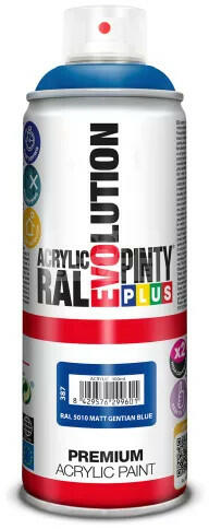 PINTYPLUS EVO AKRIL SPRAY RAL3020 - MATT ENCIÁNKÉK (MATT GENTIAN BLUE) 400ML PP387 Az PintyPlus Evolution sorozat kiváló minőségű, magas pigmenttartalommal rendelkező, ultra gyorsan száradó, oldószeres akril festék spray család. A palettán 70 különböző szín, 3 lakk, 6 metál spray és 5 fluoreszkáló spray található. Univerzálisan használható, szinte bármilyen felületen.