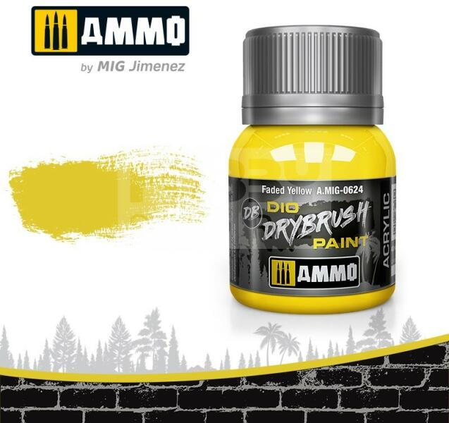 AMMO By Mig - DRYBRUSH Faded Yellow - szárazecsetelő festék 40ml - AMIG0624 Az AMMO Drybrush festékek egy új formulával készült termék mely kifejezetten a szárazecsetelős technikához lett kifejlesztve. Mindenkinek tökéletes megoldás aki szereti ezt a technikát. A DIO Drybrush sorozat világosabb színtónusokból áll hogy kopott megjelenést kölcsönözzön a maketteknek. Az AMMO