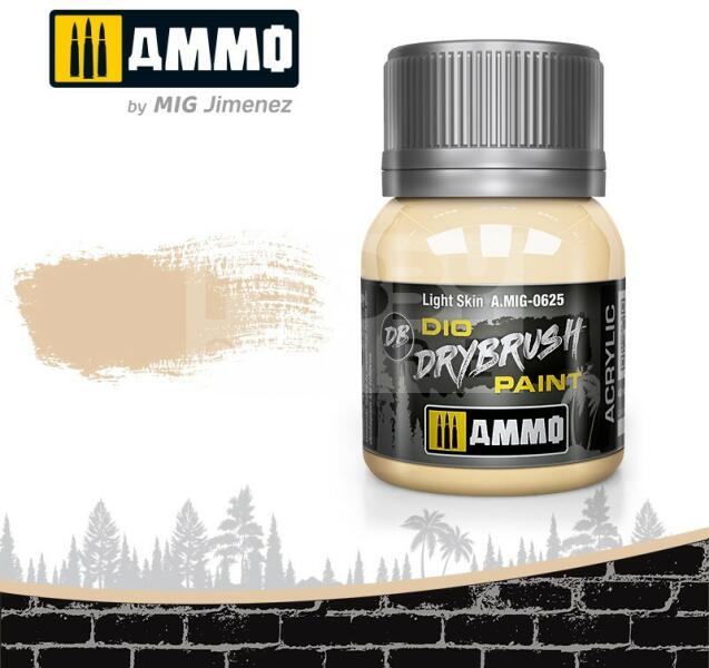 AMMO By Mig - DRYBRUSH Light Skin - szárazecsetelő festék 40ml - AMIG0625 Az AMMO Drybrush festékek egy új formulával készült termék mely kifejezetten a szárazecsetelős technikához lett kifejlesztve. Mindenkinek tökéletes megoldás aki szereti ezt a technikát. A DIO Drybrush sorozat világosabb színtónusokból áll hogy kopott megjelenést kölcsönözzön a maketteknek. Az AMMO D