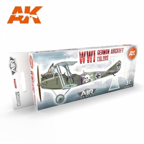 AK Interactive WWI German Aircraft Colors festék szett AK11710 Tematikus festékszett 8 darab AK Interactive 3. generációs festékkel . Új formulával rendelkező magas fedőképességű festék mely kiválóan alkalmas festékszóróval és ecsettel való használatra egyaránt. Speciális összetevőinek köszönhetően nem tömődik el festékszórónk, és felrázás után azonnal használ