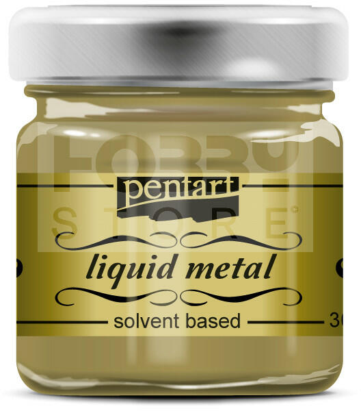 Pentart Folyékony fém arany 30 ml 21079 Magas fémpigment tartalmú, oldószeres festék, mellyel tökéletes fém-hatást érhetünk el. A festett felületet oldószeres fényes lakkal védjük. A festéshez használt ecsetet terpentines oldószerrel tisztíthatjuk. Használat elott alaposan fel kell rázni! Termék neveFolyékony fém- Liquid metalFelhasználási területmagas fémpigment tart