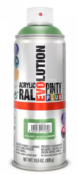 PINTYPLUS EVO AKRIL SPRAY RAL6011 - REZEDAZÖLD (RESEDA GREEN) 400ML PP609 Az PintyPlus Evolution sorozat kiváló minőségű, magas pigmenttartalommal rendelkező, ultra gyorsan száradó, oldószeres akril festék spray család. A palettán 70 különböző szín, 3 lakk, 6 metál spray és 5 fluoreszkáló spray található. Univerzálisan használható, szinte bármilyen felületen. Magas pig