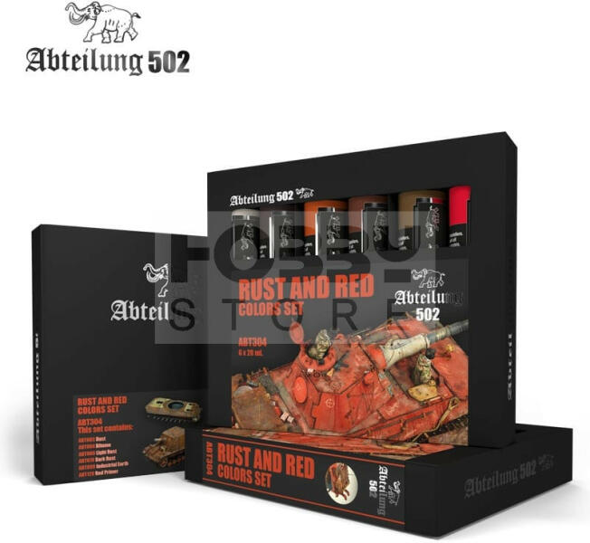 Abteilung502 - RUST AND RED COLORS SET - olajfesték szett 6X20 ml - ABT304 A készlet tartalma: ABT003 Dust ABT004 Bitume ABT060 Light Rust ABT070 Dark Rust ABT090 Industrial Earth ABT120 Red Primer Az Abteilung502 olajfesték család egy kiváló minőségű termék kifejezetten makettezőknek, és figura festőknek kifejlesztve. A termékekben kevesebb lenolaj található, így meggátolva, hog