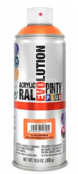 PINTYPLUS EVO AKRIL FLUOR. ORANGE - FLUORESZKÁLÓ SPRAY NARANCS 400ML PP158 Fluoreszkáló matt akril festék spray különböző színekben. Gyorsan szárad, univerzálisan használható. Kül- és beltérre egyaránt használható, szinte minden felületre (fa, fém, karton, papír, üveg és a műanyagok többsége). Megfelelő fluoreszkáló hatás elérése érdekében alapozóként hasznáj