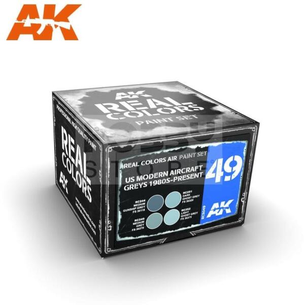 AK Interactive - REAL COLORS US MODERN AIRCRAFT GREYS 1980S-PRESENT - festékszett RCS049 Tematikus festékszett 4 darab AK Real Color festékkel. Magas miőségű akril lakk bázisú festékszett modellezéshez-makettezéshez. Használatával a lehető legpontosabb színeket érhetjük el méretarányos modelljeinken. Rendkívül jól használható festékszóróval. Az AK -Interactive Real Color