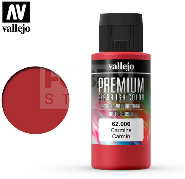 Vallejo Premium RC Colors Carmíne akrilfesték (60 ml) 62006V A Vallejo Premium RC sorozatot kifejezetten airbrush (szórópisztoly) használathoz lettek kifejlesztve. Tulajdonságának fő erőssége, hogy optimális tapadást biztosítsanak üvegszál, polietilén, polikarbonát, fém és lexan felületeken. A Premium RC sorozat speciális tartós pigmentekkel és egy új rendkívül ellenáll