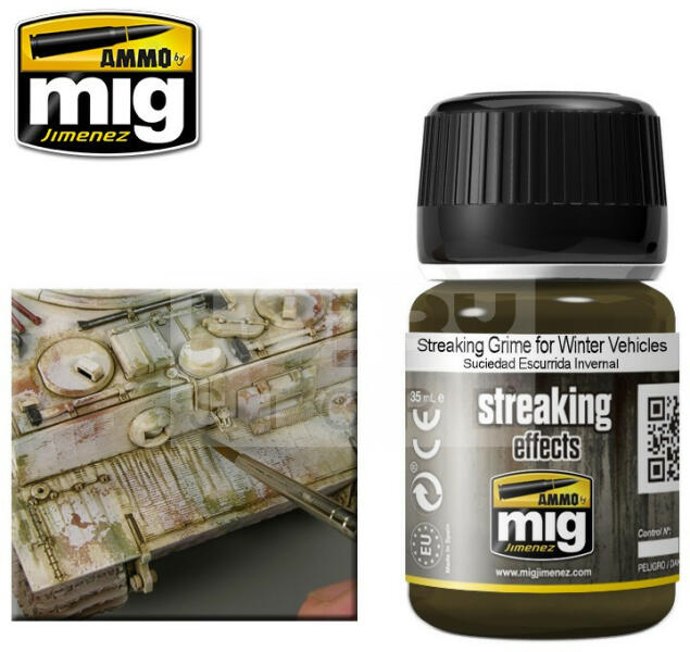 AMMO By Mig - STREAKING GRIME FOR WINTER VEHICLES - koszoló folyadék makettezőknek 35ml - AMIG1205 Az AMMO By Mig Streaking Grimes effektekkel könnyedén hozhatunk létre különböző anyagok által okozott megfolyásokat, kosz csíkokat a makettek felületein . Az AMMO Enamel alapú általános bemosó-átmosó effect folyadékok, melyek nagyon sokrétűen használhatóak. Alap technika a ma