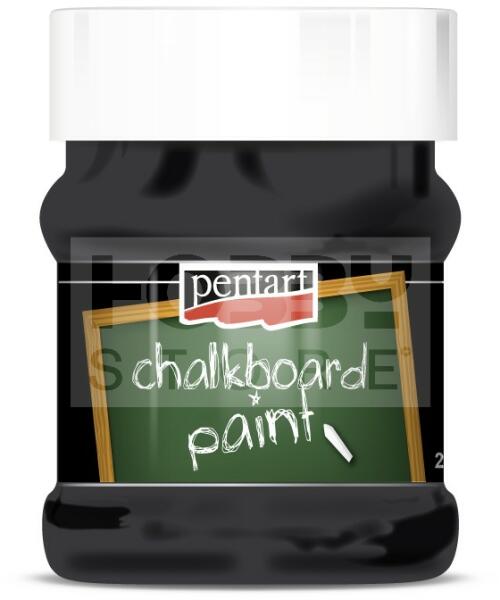 Pentart Táblafesték fekete 230 ml Fára, falra, papírra, feszített vászonra alkalmazható, vízbázisú festék. A lefestett felületre krétával írhatunk, a feliratot vizes ruhával letörölhetjük. A lecsiszolt, portalanított felületet széles ecsettel vagy szivacshengerrel fessük le. Termék neve Táblafesték - Chalkboard paint Felhasználási terület krétával írható felület k