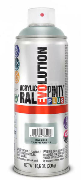 PINTYPLUS EVO AKRIL SPRAY RAL7042 - SZÜRKE (TRAFFIC GREY) 400ML PP596 Az PintyPlus Evolution sorozat kiváló minőségű, magas pigmenttartalommal rendelkező, ultra gyorsan száradó, oldószeres akril festék spray család. A palettán 70 különböző szín, 3 lakk, 6 metál spray és 5 fluoreszkáló spray található. Univerzálisan használható, szinte bármilyen felületen. Magas pigment