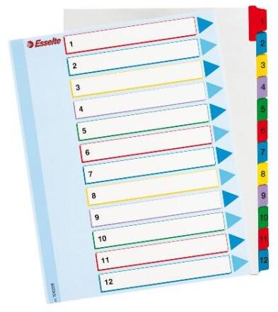 Megerősített Esselte Mylar elválasztók kiterjesztett A4 Maxi formátumban kiváló minőségű, erős kartonból, egyedi oldalak különböző színekben. Dokumentumok számszerű rendezéséhez. A többszörös perforáció lehetővé teszi a differenciálmű használatát mind a gyűrűs, mind a karos jeladókban. Címlap ismételt leírás lehetőségével. Egyszerű tájékozódás a megal