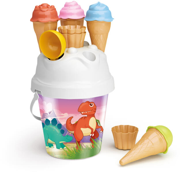 Eljöttek a dinoszauruszok, hogy Veled fagyizzanak egy nagyot. Vidd magaddal őket a homokozóba és indulhat is a homokfagyi készítés. Ebben a színes, mintás műanyag homokozószettben találsz egy 18 cm átmérőjű vödört és a fagyikészítéshez szükséges homokozóformákat.