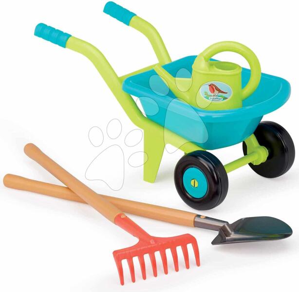 A francia Écoiffier márka kerti szerszámokkal ellátott talicskája nagyszerű ajándék fiúknak és lányoknak 18 hónapos kortól. Az egyedi kék talicskában kerti szerszámaikat szállíthatják a kicsik - zöld locsolókannát madár ábrával, nagy gereblyét és lapátot. Ezekkel a kerti szerszámokkal a gyerekek kertészi munkákat végezhetnek, és segíthetnek szüleiknek a kertben.