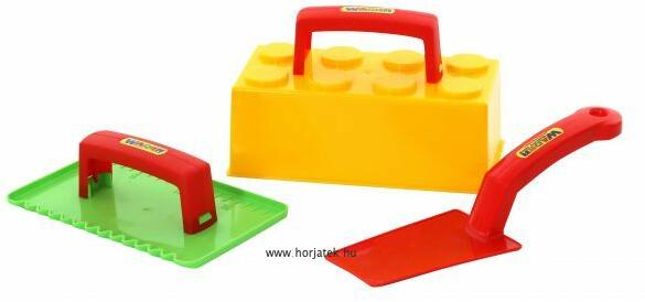 Három részes homokozó készlet, vegyes színekben. A kis kőművesek számára ideális kiegészítő játék betonkeverőhöz. Ezzel a készlettel már kezdődhet is a falazás. A készlet egy Lego elem formájú nyeles homokozó formát, egy simítót és egy kőműves kanalt tartalmaz. Játék után gondosan tisztítsd meg az eszközöket!