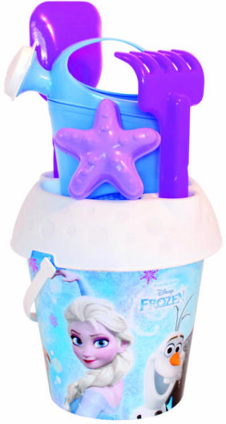 Jégvarázs mintás műanyag homokozószett. Részei: vödör, szita, locsolókanna, lapát, gereblye, forma. Mérete: 31cm.