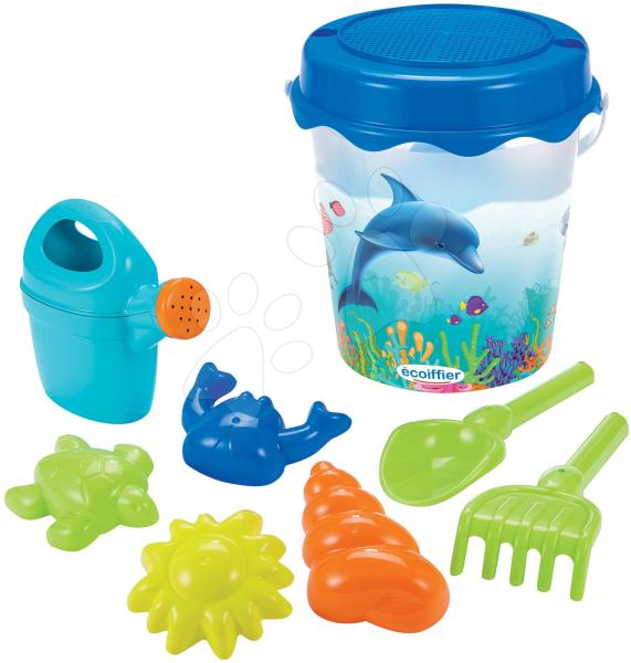 Vödör szett Delfin a francia Écoiffier vállalat műhelyéből egy szupermenő játék készlet homokozóba delfinnel díszített vödörrel, mely kisfiúkat és kislányokat is egyaránt boldoggá tesz már 18 hónapos kortól . A színes vödrön kívül a csomagban talál szitát, lapátot , gereblyét , szép kék locsolókannát , mely nagy segítséget nyújt a növények öntőzésében