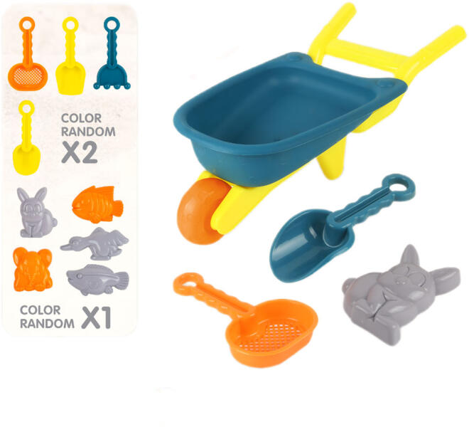 A gyerek játék szett homokozóban használható. A játékoknak köszönhetoen már nem kell gondoskodnia a gyerekek szórakozásáról a strandon, vagy a homokozóban. A szett egy markológépet, 2 poharat, lapátkát és villát tartalmaz. Nem foglalnak sok helyet, könnyen hordozhatók egyik helyrol a másikra.