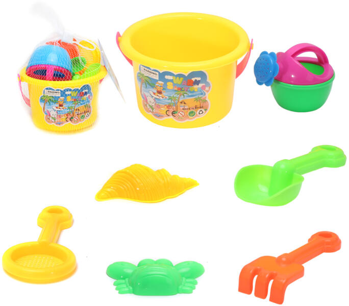 Színes műanyag homokozószett várépítős vödörrel. A szett tartalma: 18 cm átmérőjű vödör, szita, lapát, gereblye, formák, malom. A játék 100%-ban újrahasznosítható, nem mérgező, nap- és vízálló műanyagból készült. Mérete: 35 cm