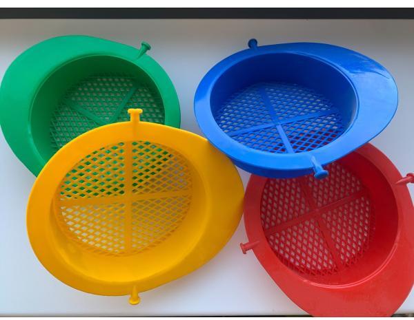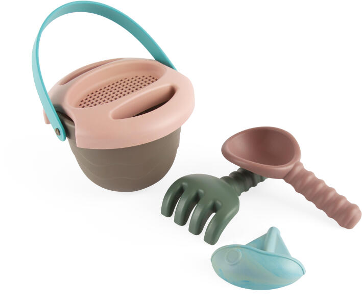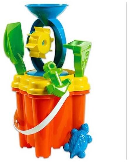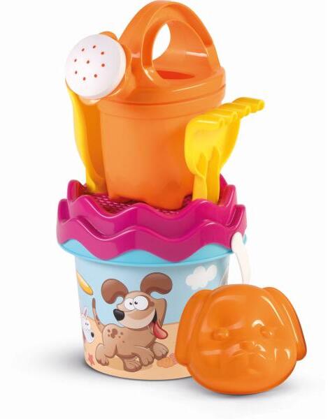 6 részes homokkészlet kiváló minőségű műanyagból készült Olaszországban készült Tartalmaz: vödör (átmérő 13 cm, magasság 11 cm) egy 0,5 literes teáskanna szűrő lapát gereblyék kutyafej formájú penész.