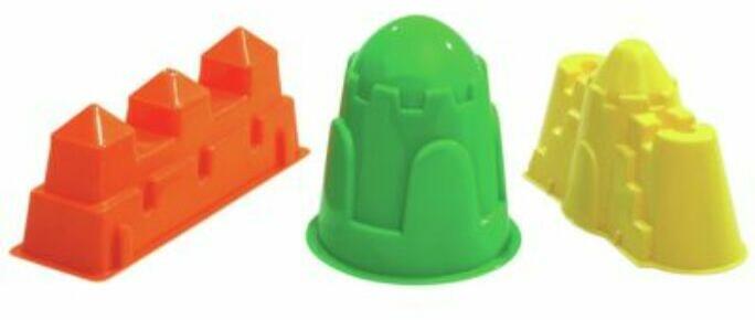 Három részes homokozó készlet különböző formájú és színű várkiöntővel. Az Európai Unió szabványainak megfelelő termék, CE-minősítéssel.