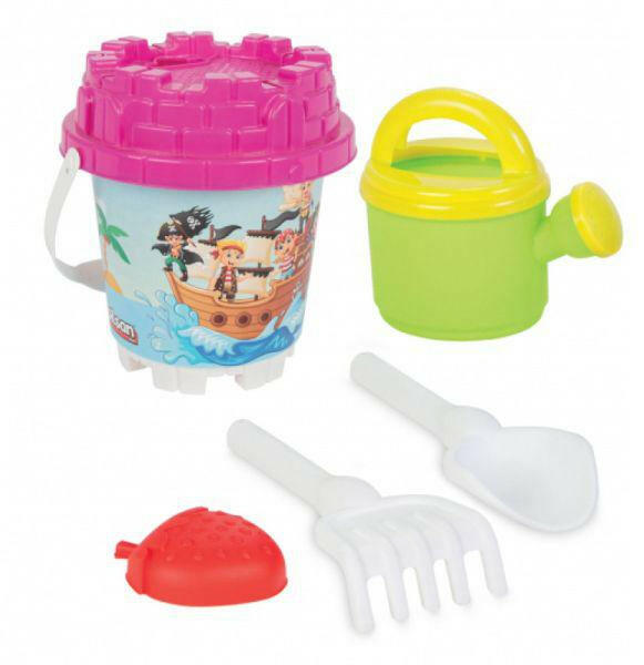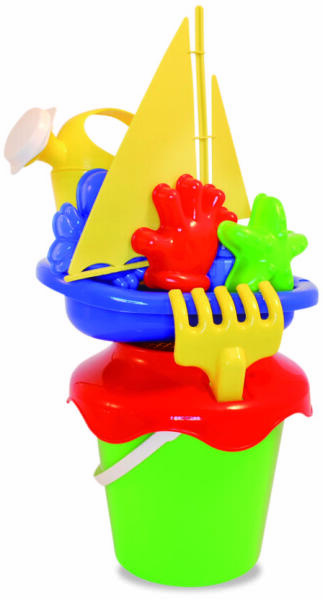 Színes műanyag homokozóvödör vitorlással. A termék 100%-ban újrahasznosítható, nem mérgező műanyagból készült, ami nap és vízálló. A szett tartalma: 18 cm átmérőjű vödör, szita, lapát, gereblye, formák, locsolókanna, vitorlás.