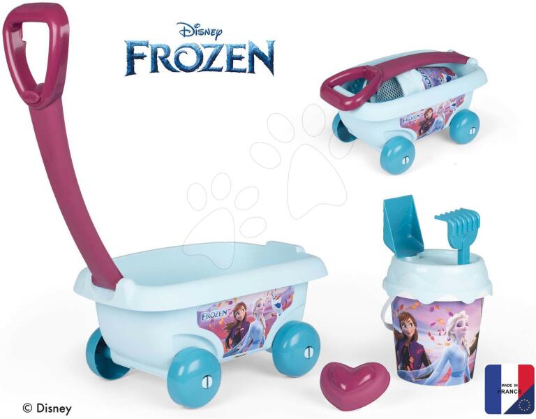 Húzható kiskocsi vödör szettel a francia Smoby vállalat műhelyéből egy igazán pompás ajándék homokozóba főleg kislányok részére már 18 hónapos kortól. Tarka játékszetten a közkedvelt hercegnő testvérpáros, Anna és Elza ábrája látható a Jégvarázs meséből, akiket gyerekek világszerte ismernek és nagyon szeretnek. Egész mesés szett egy lehajtható fogantyúval k