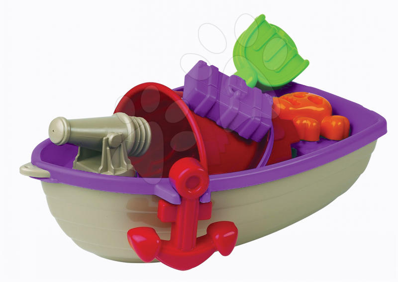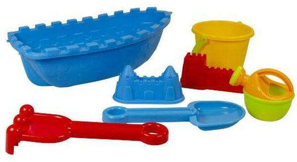 Színes homokozó szett kishajóval, amely egyaránt használható a kertben, a strandon vagy a tengerparton. Vastag, strapabíró műanyagból készült. A szett tartalma: - hajó - vödör - gereblye - lapát - 2 db homokozó forma - kanna 2 éves kortól ajánljuk.