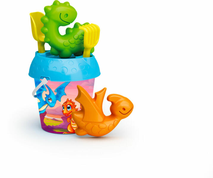 Színes műanyag homokozószett dinoszauruszos mintával. A szett részei: 18 cm átmérőjű vödör, szita, lapát, gereblye, forma. A játék 100%-ban újrhasznosítható, nem mérgező. Nap- és vízálló műanyagból készült.