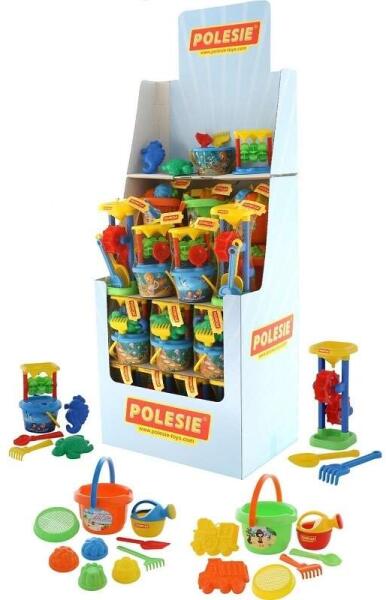 Homokvödrök + kiegészítők, 36 db/kijelző, Polesie - A karton kijelző 36 készletet tartalmaz a homokkal és vízzel való játékhoz. - A játékok műanyagból készülnek. - A készletek 4 különböző modellben kaphatók. - A feltüntetett ár egy 36 készletből álló kijelzőre vonatkozik.