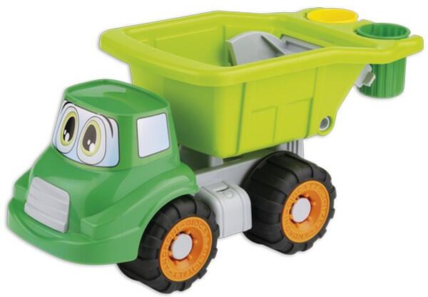 Szelektív hulladékgyűjtő teherautó, a szélvédőjén kedves szemekkel. Mérete: kb. 32 x 12,5 x 14,5 cm.