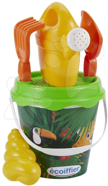 Vödör szett Jungle Écoiffier egy csodaszép játékszett homokozóba kisfiúknak és kislányoknak 18 hónapos kortól. Ebben a bájos és érdekes játékszettben gyermeke locsolókannát , dzsungel motívummal díszített vödröt szitával , lapátot , gereblyét és kagyló formájú homokozóformát talál. Vödör szett élénk színkivitelezése serkentően hat a fantázia fejlődésére