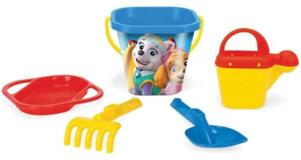Az 5 részes Mancs Őrjárat homokozó készlet minden Paw Patrol rajongó gyerek kedvence lesz! A szettben vödör, szita, lapát, gereblye, és locsolókanna is található, amik elengedhetetlen kellékek a játszótéren, vagy a vízparton. A homokozó vödör mintáján Chase, Marshall, Sky és Everest is látható. A homokozó játékokokon lévő minták különleges eljárással (In Mold La