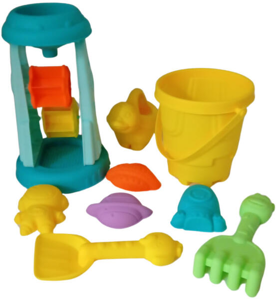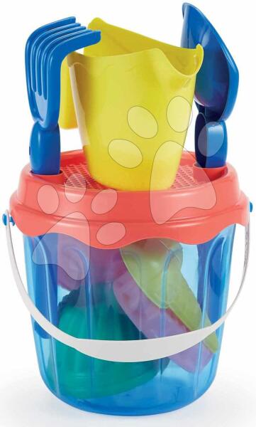 Écoiffier homokozó szett nagyon szép színes játék homokozóba gyerkőcöknek nyárra. A játék szett 9 darab szerszámból áll. Gyerek homokozó szett fő eleme az áttetsző vödör , melybe csemetéje bármit belerakhat és a vödör áttetsző falán keresztül figyelheti a tartalmát. Továbbá locsolókannából fagyis motívummal díszítve, szitából , kislapátból , gereblyéből
