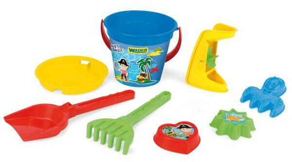 Vagány homokozószett építeni és rombolni vágyó kicsiknek! Ezzel a kiváló minőségű Wader homokozószettel élmény lesz a kertben, a strandon vagy a tengerparton történő építés és a rombolás. A 8 részes szett egy aranyos grafikával díszített és praktikus fogantyúval ellátott vödröt, gereblyét, lapátot, különböző alakú homokozóformákat, szitát és egy malmot is