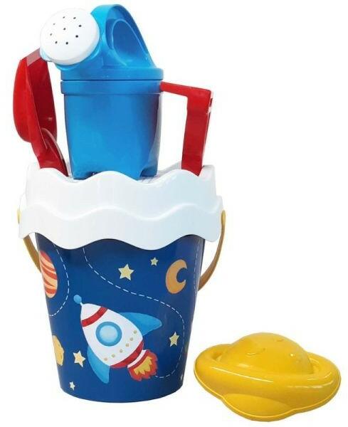 Vidám, űrutazás témájú homokozó szett, amely egyaránt használható a kertben, a strandon vagy a tengerparton. Vastag, strapabíró műanyagból készült. Hálós csomagolásban érkezik. A vödör átmérője: 17 cm. Az öntözőkanna űrtartalma: 0,5 liter. Csomagolás mérete: 17 x 35 cm. Tartalom: Vödör, locsolókanna, szita, lapát, gereblye, homokozóforma.