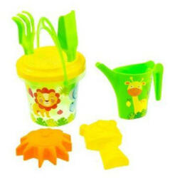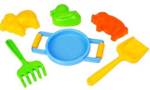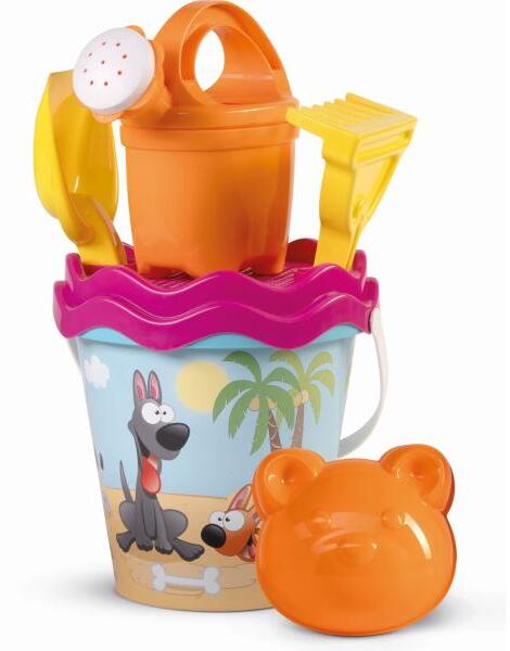 6 részes homokkészlet kiváló minőségű műanyagból készült Olaszországban készült Tartalmaz: vödör (átmérő 17 cm, magasság 16 cm) egy 0,5 literes teáskanna szűrő lapát gereblyék egy kutyafej formájú penész