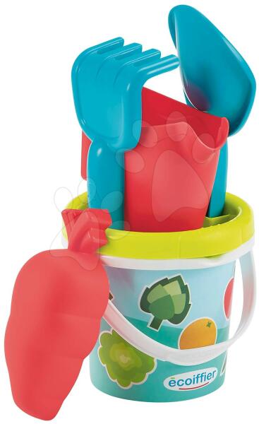 Vödör szett répával Garden&Seasons a francia Écoiffier vállalat műhelyéből egy igazán egyedi játékszett gyerekeknek már 18 hónapos kortól. Tarka vödör nyári motívummal magassága 12 cm, tartozik hozzá lapát, gereblye és piros locsolókanna is. A szett részét képezi répa alakú homokozóforma is, mellyel menő formákat tud majd csemetéje a homokba varázsolni. Játsz