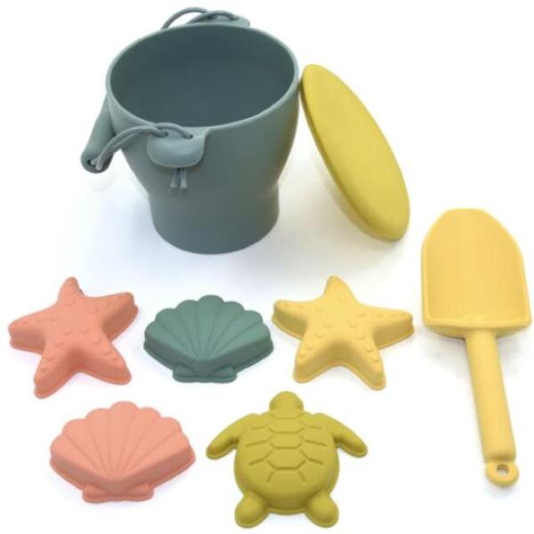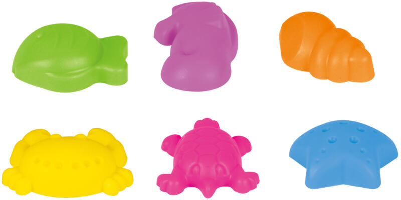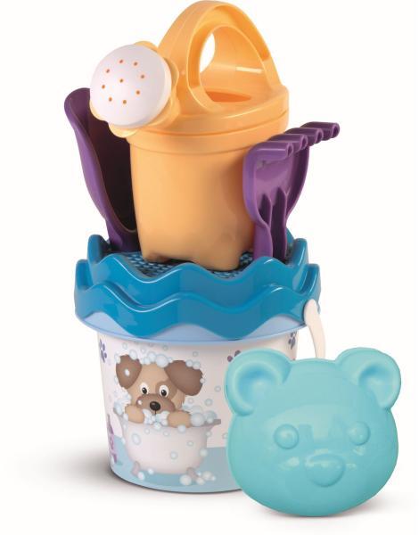 6 részes homokkészlet kiváló minőségű műanyagból készült Olaszországban készült Tartalmaz: vödör (átmérő 13 cm, magasság 11 cm) egy 0,5 literes teáskanna szűrő lapát gereblyék kutyafej formájú penész.