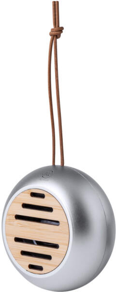 Újrahasznosított alumínium bluetooth hangszóró bambusz hálós résszel és műbőr hordszíjjal. Beépített újratölthető akkumulátorral. USB töltőkábellel szállítjuk.